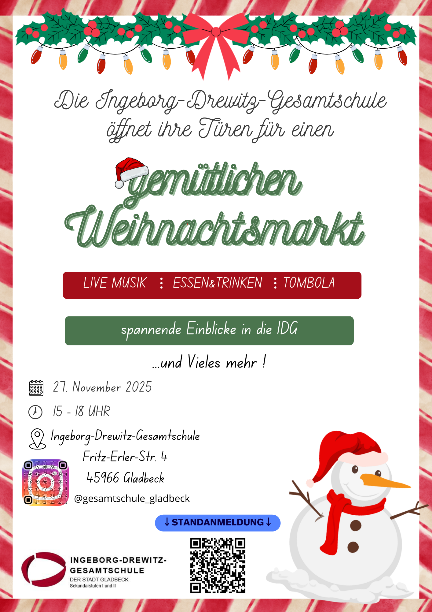 Am Donnerstag, 27.11.2025 öffnet die Ingeborg-Drewitz-Gesamtschule von 15 bis 18 Uhr ihre Türen für einen gemütlichen Weihnachtsmarkt in Kombination mit einem Tag der offenen Tür.
