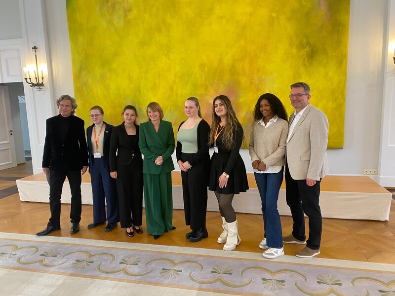 Im Bild von links nach rechts: Florian Langenscheidt (Mitbegründer von Jugend hilft!), Leonie Tara Hanisch, Julia Marie Skrabarczyk, Elke Büdenbender, Annika Opper, Farah Ibrahim, Treazer Phiri (Lehrerin aus Sambia), Guntram Seippel (Ingeborg-Drewitz-Gesamtschule, AG Leiter)