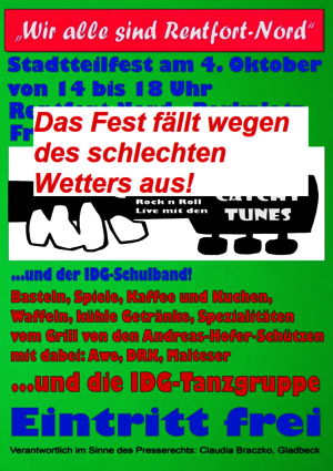 | Startchancen BlogWeiterlesenDas große Stadtteilfest in Rentfort sollte dieses Jahr am 4. Oktober von 14 bis 18 Uhr auf dem Parkplatz an der Fritz-Erler-Straße steigen. Die…